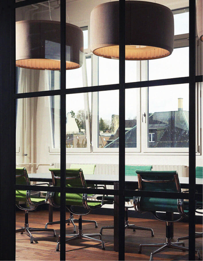 High ceilings, large windows, wooden floors, acoustic panels, and premium furniture from Vitra and ListaOffice offer the best working conditions. The room layout of the two L-shaped floors are optimized for both deep work and close collaboration among high-performance teams.